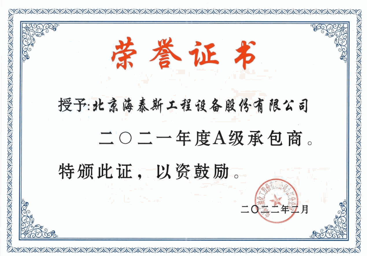 海泰斯獲評“A級承包商”榮譽(yù)稱號(hào)